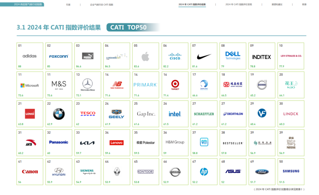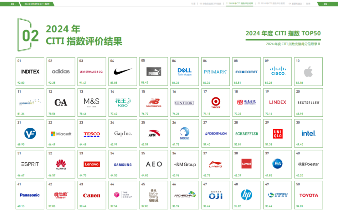 2024年,IPE全面升级CITI指数和CATI指数。升级后的CITI指数重点关注供应链合作,从管理机制、合规与整改、资源消耗与污染物排放、能源使用与应对气候变化、利益方绿色选择五个维度对企业的绿色供应链管理开展量化评价;CATI指数重点完善产品碳足迹披露和价值链减排相关指标,从治理机制、测算披露、碳目标设定、碳目标绩效和减排行动五个维度对企业在气候治理方面的行动开展动态评价。