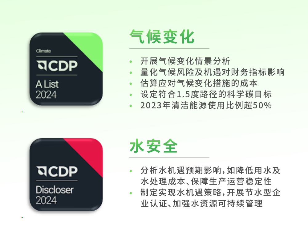全球环境信息研究中心(CDP)评级,被广泛视为衡量企业环境透明度和可持续发展行动的重要基准,覆盖全球超22000家公司。近日,CDP公布2024年评级结果,六合皇 评级连续四年稳步提升,在气候变化领域获评「A」级、水安全领域获评「A-」级,双双位列全球领导力等级,这一突破高度认可了六合皇 在气候变化的应对和水资源的可持续利用方面的努力和成果。
